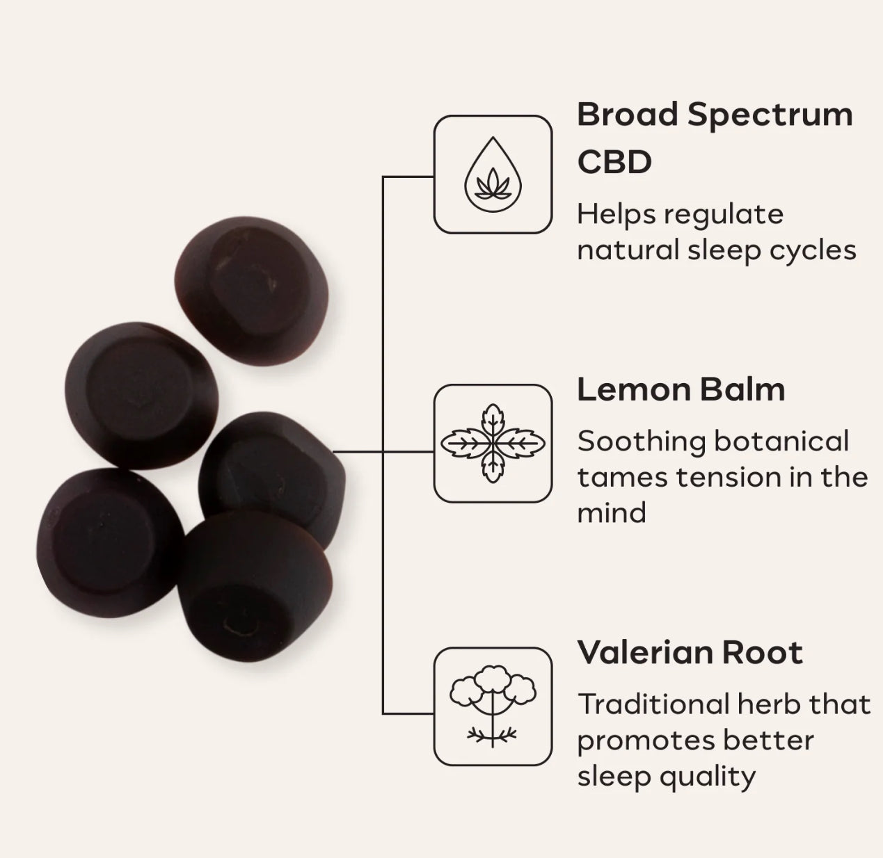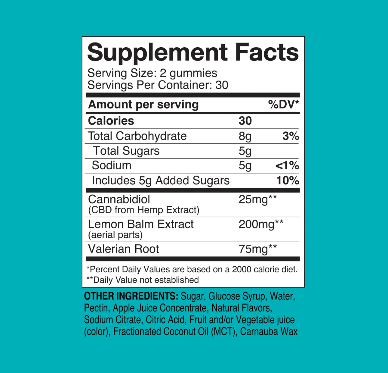 - Each serving contains 25mg of CBD and a potent botanical blend of Lemon Balm and Valerian Root. Melatonin-free formula.